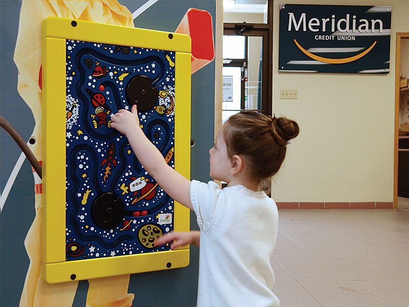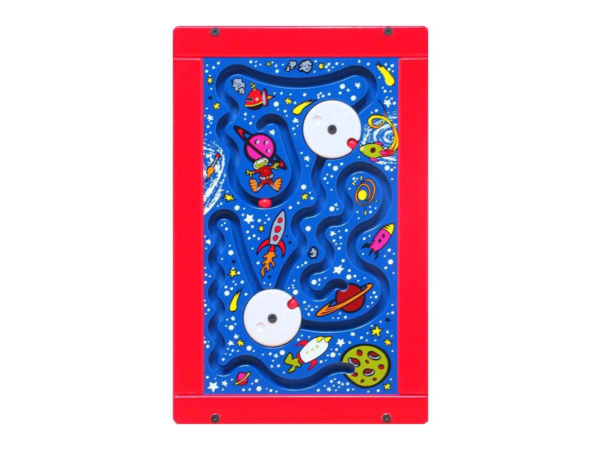 Painel de jogo para fixação directa a parede. Movimente a bola entre as rotas espaciais até encontrar os planetas. Moldura em MDF na cor amarela RAL 1023 ou vermelha RAL 3020. Percursos de bola com faixas recortadas.