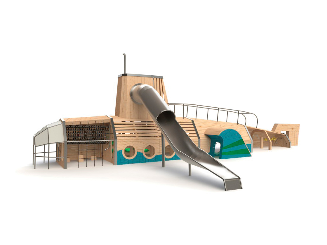 Centro de atividades em forma de um grande submarino, feito em madeira de robínia, composto, na parte superior, por um escorrega tubular (fechado na secção mais elevada de entrada e aberto na secção final, com pega de apoio de mãos na entrada, com acesso pelo interior e pelo casco), por um periscópio, uma parede de escalada no casco e um varandim por cima do casco com duas proteções tubulares. Na parte inferior é composto por uma zona coberta para brincadeira livre, 2 entradas retangulares de acesso a uma área com um túnel de corda suspenso para atravessar, que tem acesso por um degrau tipo ranhura para apoio de pés com dois apoios de mãos tubulares e que liga a uma plataforma elevada, com degrau tipo ranhura e apoios de mãos tubulares para acesso à zona superior (onde se encontra o escorrega), 3 troncos cortados com diferentes alturas para caminho de equilíbrio ou para sentar, uma rede para trepar (no casco), dois telefones tubulares sem fios (para comunicar com a área seguinte e com a zona superior), um leme, 3 escotilhas e duas entradas retangulares de acesso à área seguinte com um assento suspenso tipo “Hammock” para sentar e balançar, duas redes para trepar e uma última área com dois volantes para manusear, duas janelas circulares para espreitar e um eixo propulsor com peças para manusear, ligado a uma hélice no exterior. A estrutura é ainda composta por uma onda na lateral do submarino com parede de escalada, no exterior, com presas, uma zona abrigada para estar e um acesso circular ao interior do submarino e na outra lateral, duas ondas com parede de escalada exterior, com presas e no interior com um conjunto de 5 cordas verticais com peixes de madeira e esferas sonoras, para trepar, baloiçar e produzir som. Ideal para brincar ao “faz de conta”, escorregar, trepar, rastejar, atravessar, esconder, abrigar, balançar, descansar, manusear, equilibrar, socializar, superação de obstáculos e estímulo sensorial e cognitivo. Para fixação a sapatas de betão.