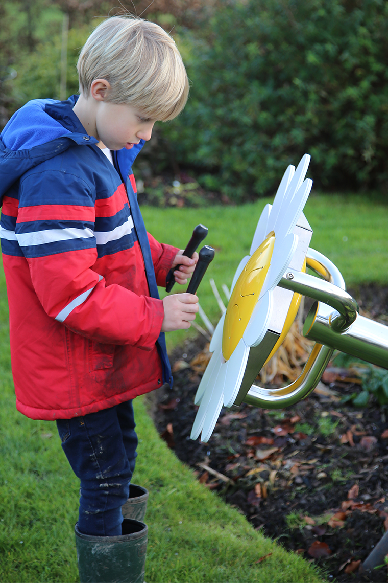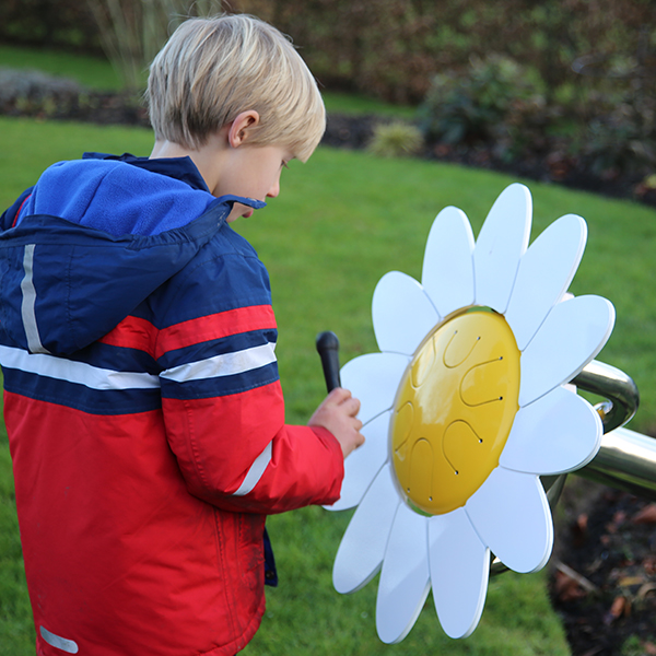 Instrumento musical de exterior temático inspirado na natureza e afinado à escala pentatónica lá menor (A-C-D-E-G-A). Composto por um tubo e estrutura de suporte de aço inoxidável e uma flor margarida com um centro amarelo contendo um pequeno Babel Drum (24 cm) envolto em pétalas de alumínio branco. Inclui um conjunto de 2 baquetas à prova de vandalismo, macias e flexíveis, projetadas especificamente para produzir tons deliciosamente suaves. Equipamento inclusivo, possível de ser usado por utilizadores em cadeiras de rodas, e perfeito para estímulo sensorial, cognitivo e musicoterapia.