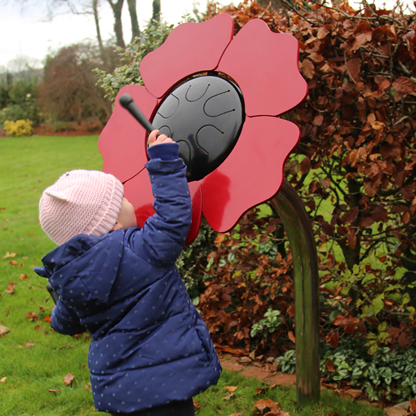 Instrumento musical de exterior temático inspirado na natureza e afinado a A Akebono (A-B-C-E-F-A), uma escala japonesa tradicional e bem conhecida com um som oriental distinto. Composto por um tubo e estrutura de suporte de aço inoxidável e uma flor margarida com um centro preto contendo um pequeno Babel Drum (24 cm) envolto em pétalas de alumínio vermelhas. Inclui um conjunto de 2 baquetas à prova de vandalismo, macias e flexíveis, projetadas especificamente para produzir tons deliciosamente suaves. Equipamento inclusivo, possível de ser usado por utilizadores em cadeiras de rodas, e perfeito para estímulo sensorial, cognitivo e musicoterapia.