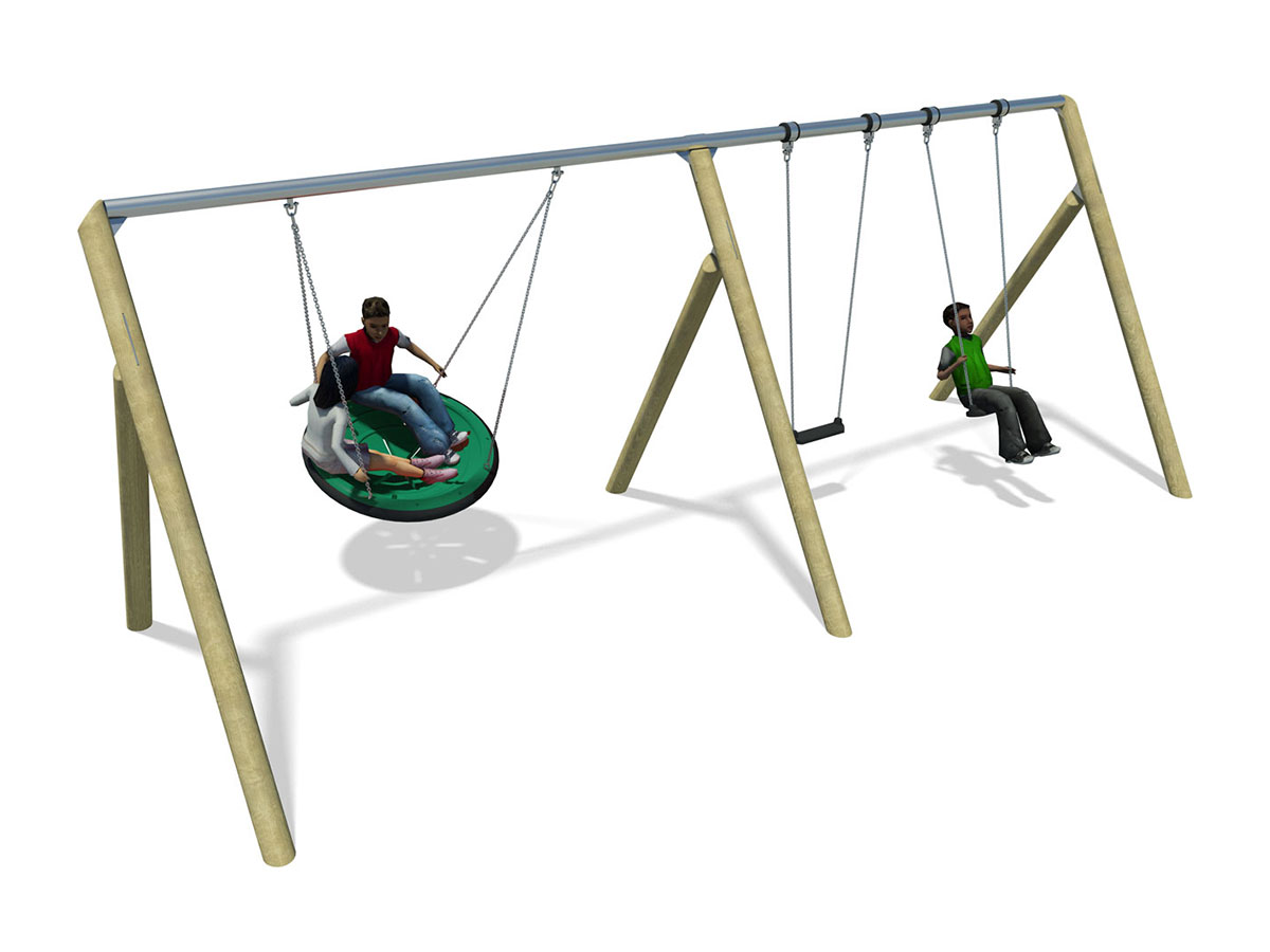 Baloiço inclusivo, composto por 1 pórtico com 6 postes em madeira e 2 traves de aço galvanizado (ref.ª TJS/2/AW), 1 assento de grupo tipo ninho de pássaro na cor laranja (ref.ª SEAT7) colocado a 45cm do solo e suspenso por 4 correntes de aço inoxidável, 2 assentos individuais planos em borracha (ref.ª SEAT1/AW) com correntes em aço inoxidável e 6 fixadores de correntes, com sistema de segurança “anti-wrap” (não enrolam na trave do baloiço). Para fixação com pés metálicos em fundação (os postes deverão ficar enterrados a 80cm de profundidade). Ideal para experienciar velocidade e movimento, interação social, avaliação de risco, estímulo sensorial, desenvolvimento da motricidade, agilidade, coordenação e equilíbrio.