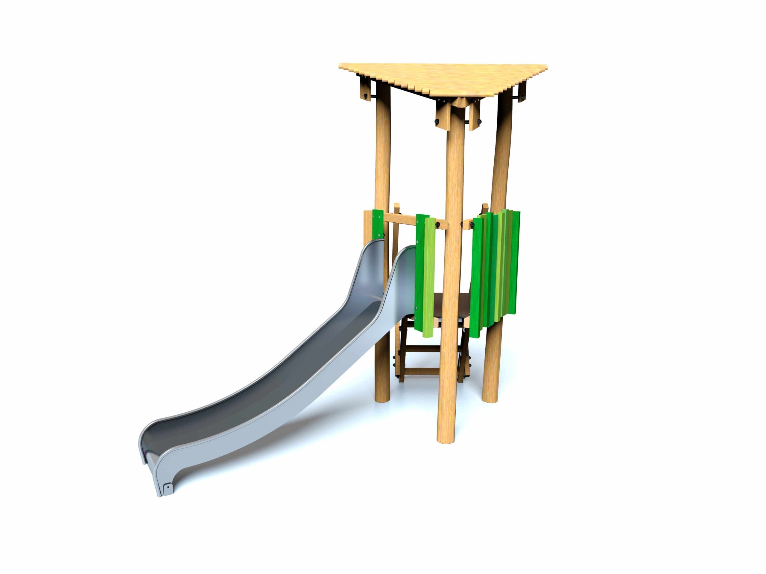 Torre de atividades composta por 1 torre triangular feita em madeira de robínia, com telhado, guardas de proteção coloridas, plataforma a 0,97m de altura, 1 escada de acesso e 1 escorrega com 0,97m de altura. Ideal para escorregar, socializar e trepar.