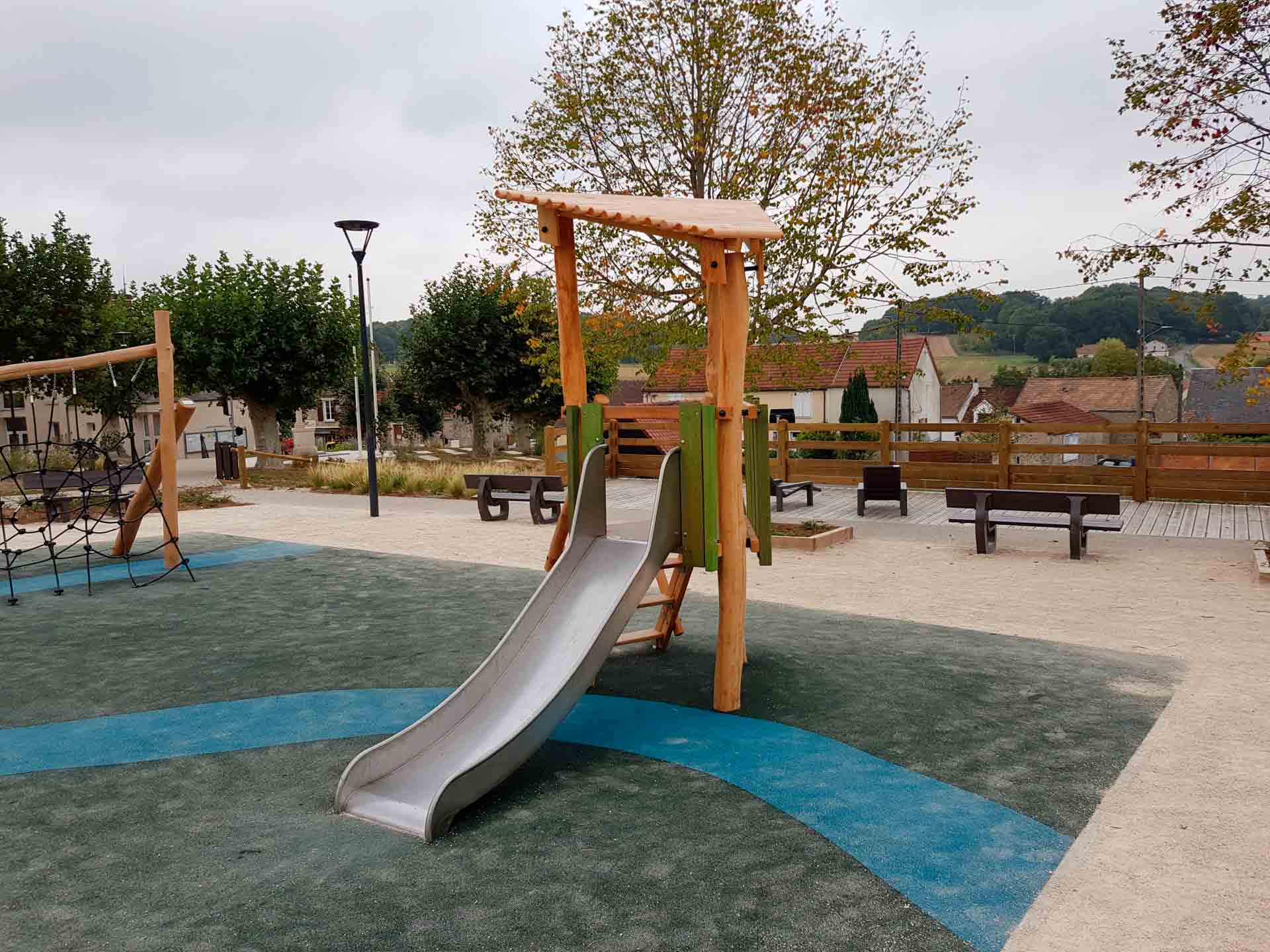 Materiais: Os diferentes postes (60 a 80mm/ 100 a 120mm/120 a 140mm de diâmetro) são feitos de robínia sem seiva e sem casca. A madeira de robínia é lixada e como é naturalmente à prova de podridão não requer nenhuma proteção química adicional. É igualmente extremamente resistente a ataques de fontes externas (insetos, fungos, variações climáticas), garantindo a durabilidade a longo prazo ao equipamento. As plataformas são feitas de um material compacto antiderrapante (HPL) de 12,5 mm de espessura. Um reforço adicional é fornecido por suportes de aço galvanizado, localizados na parte inferior das plataformas. Os painéis e os degraus são feitos de larício (pranchas de 140 x 27mm / 45 x 68mm), naturalmente resistente e duradouro. Os painéis coloridos são tingidos em tonalidades de verde. O telhado é feito de troncos de larício (80 x 40 mm). O escorrega é feito de aço inoxidável. Fixações de aço inoxidável protegidas por tampas antivandalismo em poliamida.