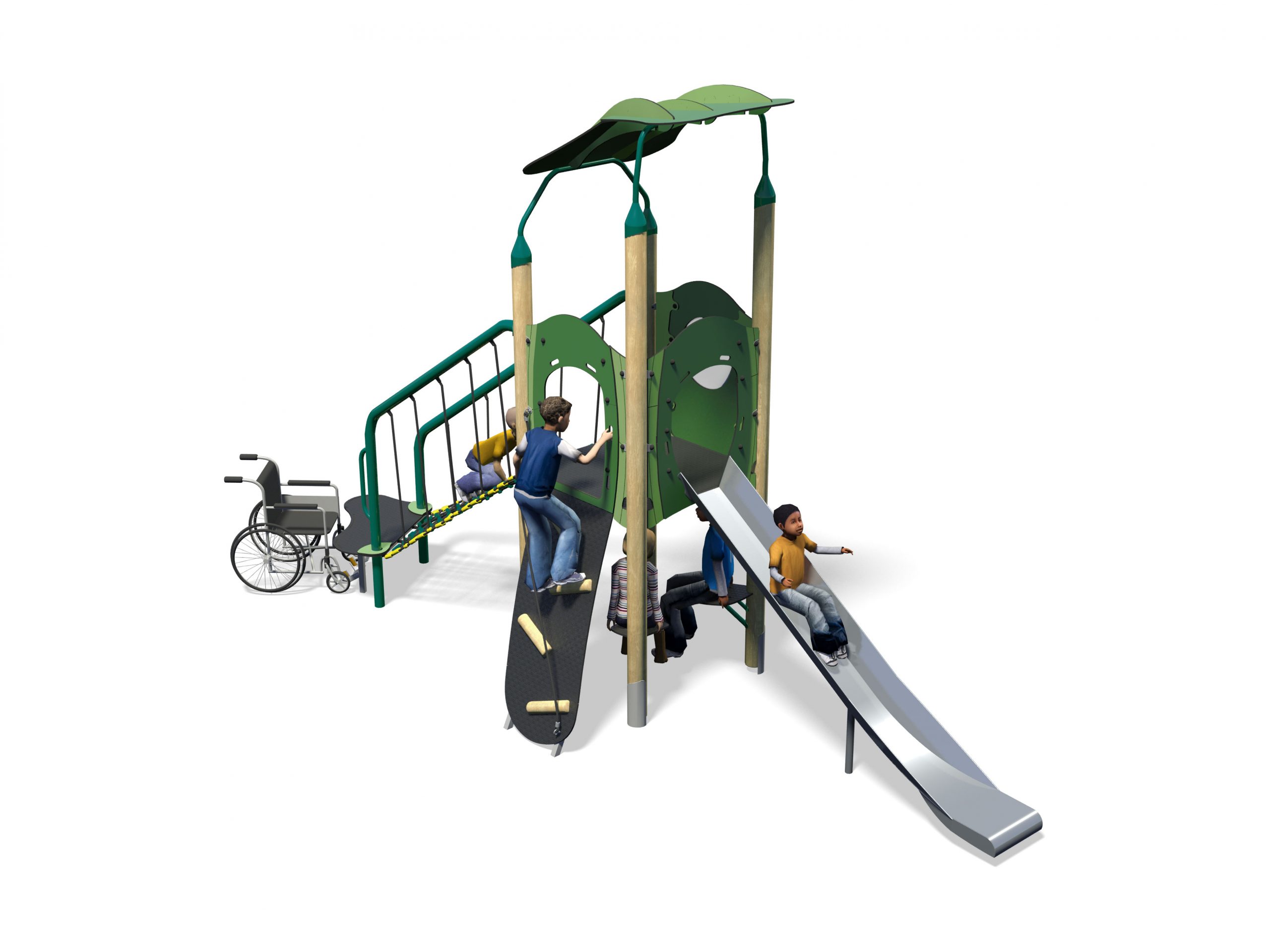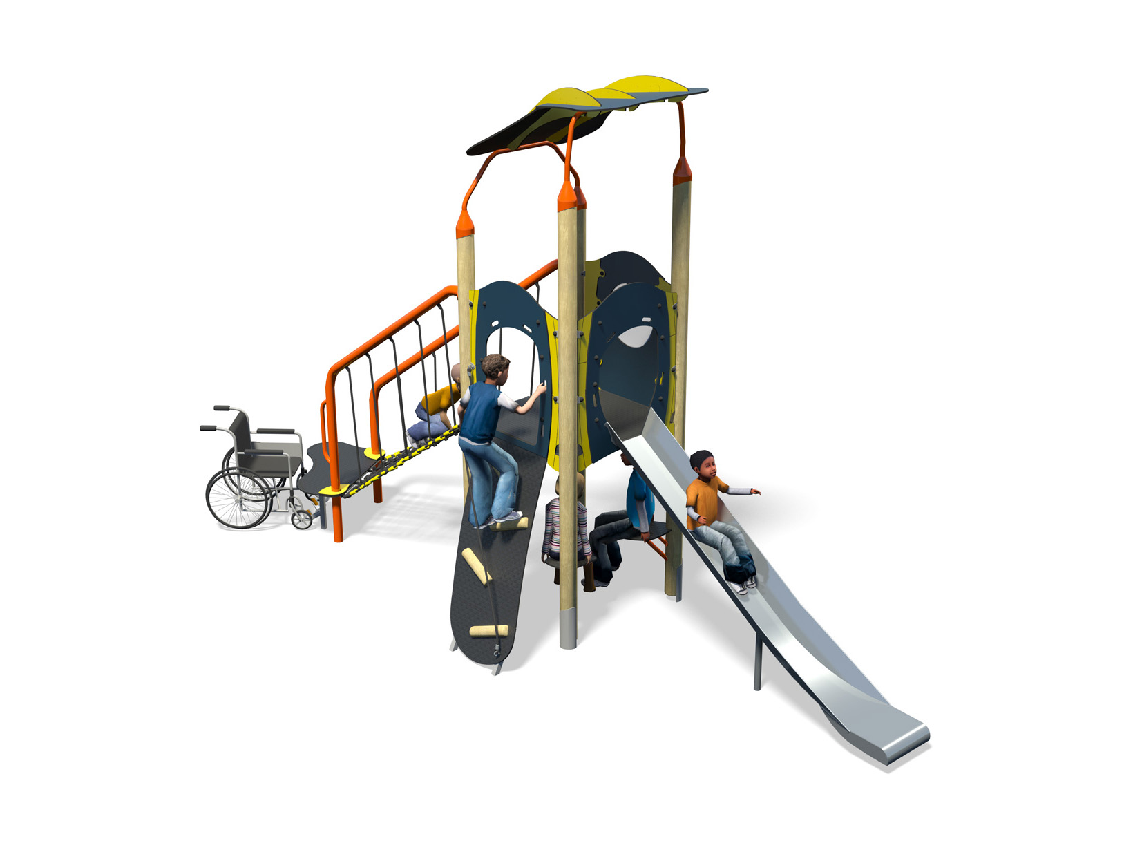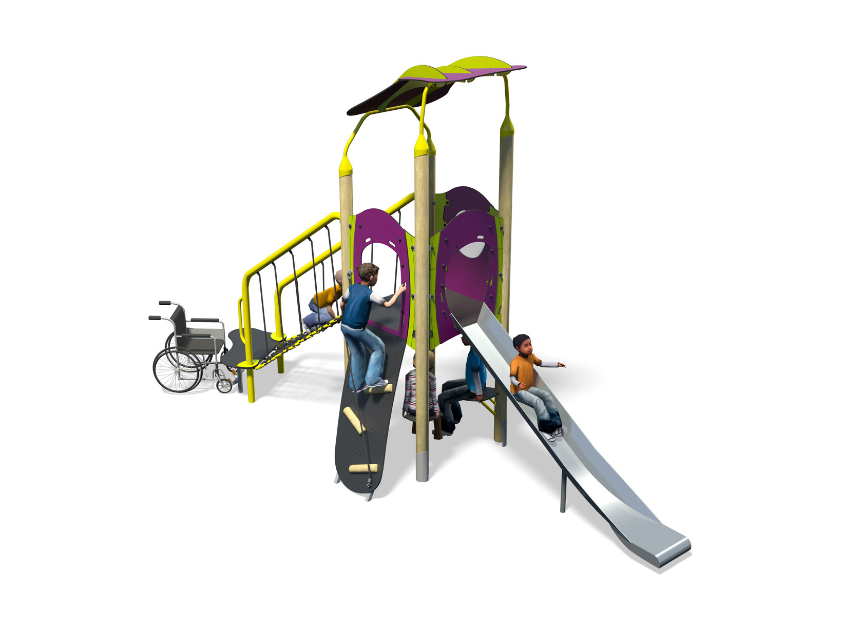 Torre de atividades inclusiva composta por 1 plataforma de transferência, 4 postes, 1 torre quadrada com 1,5m de altura, 1 rampa de rede inclusiva com proteções laterais metálicas e cordas, 1 escorrega em aço inoxidável com 1,50m de altura, 1 parede inclinada de trepar com corda e apoio de pés, 1 painel bolha, 3 painéis coloridos, e 2 assentos debaixo da torre. Para trepar, escalar, escorregar, treino de equilíbrio e coordenação, socialização e estímulo sensorial.