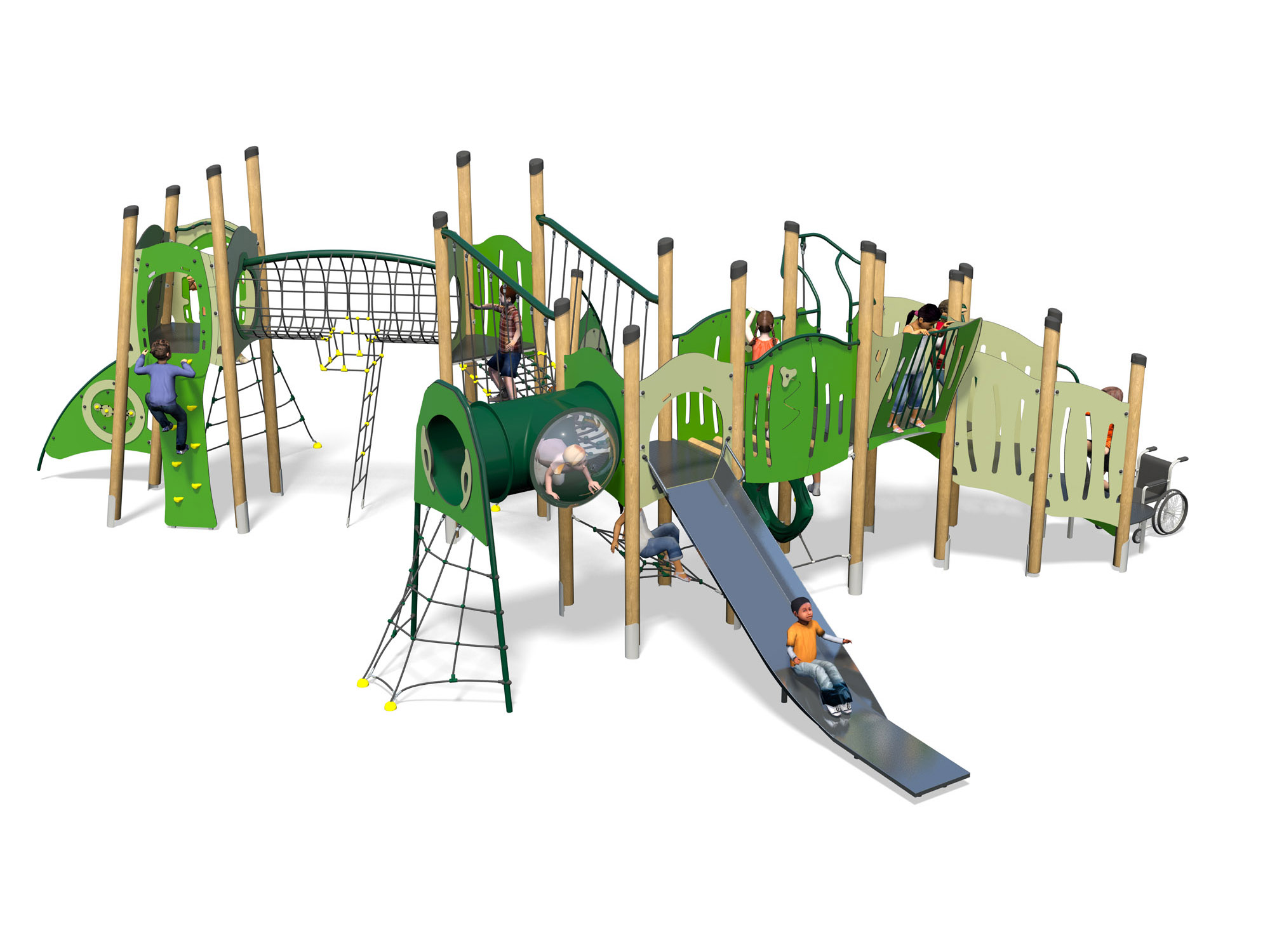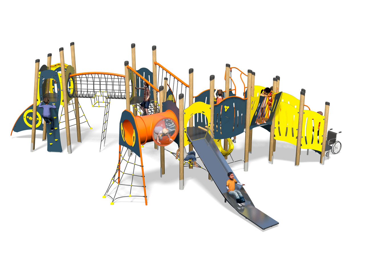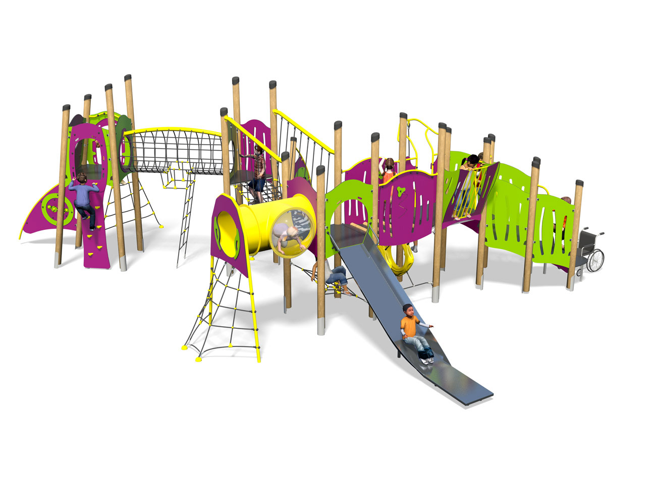 Torre de atividades inclusiva com escorrega largo de aço inoxidável. Composta por 18 postes, 2 torres quadradas com 1,5m de altura, 1 torre angular com 1,9m de altura, 1 torre triangular com 1,9m de altura, 1 plataforma de transferência, 1 ponte com várias plataformas de transferência e barras metálicas no interior para apoio de mãos, 1 escorrega com 1,50m de altura, 1 parede de escalada com 1,9m, 1 rede de trepar tipo marinheiro com 1,5m de altura, 1 rede torcida com 1,9m de altura, 1 ponte de túnel com uma vigia bolha, 1 túnel para gatinhar com 2 anéis de plástico, 1 rede inclinada de trepar, 1 túnel de rede, 1 ponte, 1 rede de suspensão, 1 assento de rede, 1 torre vigia, 1 arco metálico na lateral com painel de jogo labirinto, 1 painel de jogo “Ball Blast” para 2 jogadores e vários painéis coloridos. Para trepar, escalar, escorregar, suspender, baloiçar, jogar, treino de equilíbrio, coordenação, motricidade, socialização, estímulo sensorial e cognitivo.
