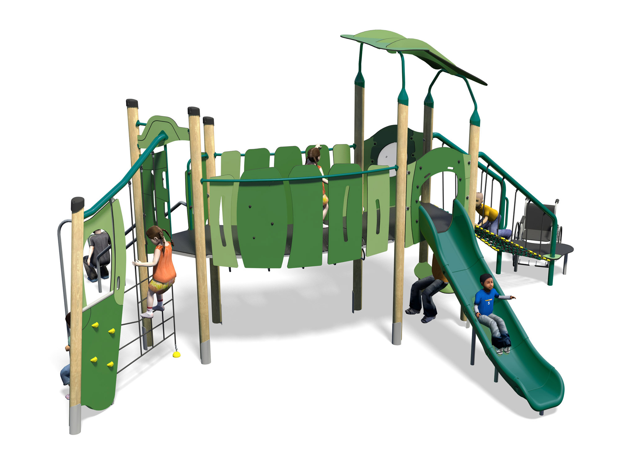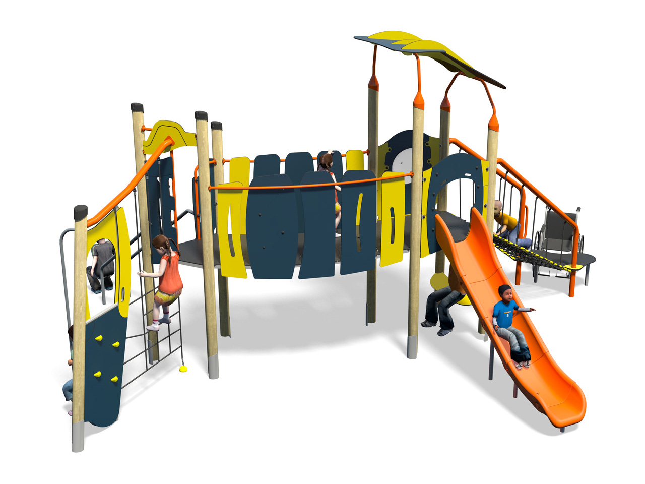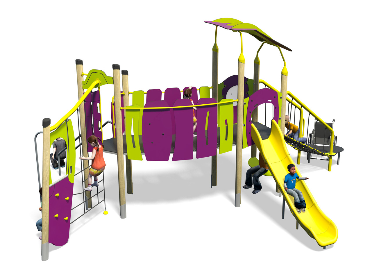 Torre de atividades inclusiva composta por 1 plataforma de transferência, 1 rampa de rede inclusiva com proteções laterais metálicas e cordas, 1 torre quadrada com 1,5m de altura, 1 torre triangular com 1,5m de altura, 1 escorrega de polietileno com 1,50m de altura, 1 escorrega com 2 barras metálicas paralelas, 1 ponte curva, 1 saída de bombeiro, 1 assento, 1 parede de escalada, 1 rede vertical de cordas, 8 postes, 1 telhado com painéis coloridos, 1 painel bolha transparente e vários painéis coloridos. Para trepar, escalar, escorregar, suspender, treino de equilíbrio, coordenação, motricidade, socialização e estímulo sensorial.