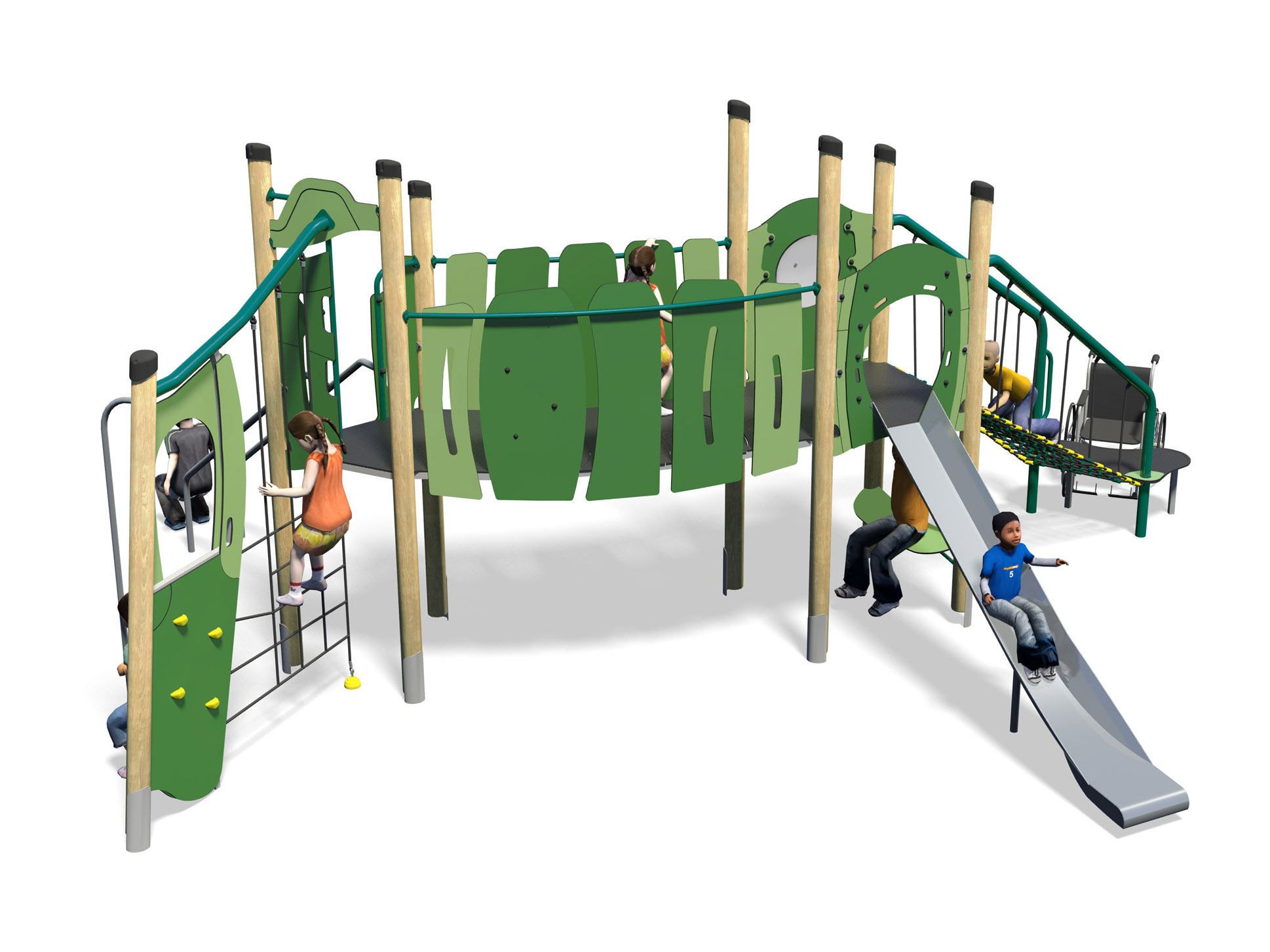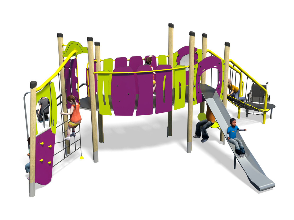 Torre de atividades inclusiva composta por 8 postes, 1 plataforma de transferência, 1 rampa de rede inclusiva com proteções laterais metálicas e cordas, 1 torre quadrada com 1,5m de altura, 1 torre triangular com 1,5m de altura, 1 escorrega de aço inoxidável com 1,50m de altura, 1 escorrega de aço inoxidável com 2 barras metálicas paralelas, 1 ponte curva, 1 saída de bombeiro, 1 assento, 1 parede de escalada, 1 rede vertical de cordas, 1 painel bolha transparente e vários painéis coloridos. Para trepar, escalar, escorregar, suspender, treino de equilíbrio, coordenação, motricidade, socialização e estímulo sensorial.