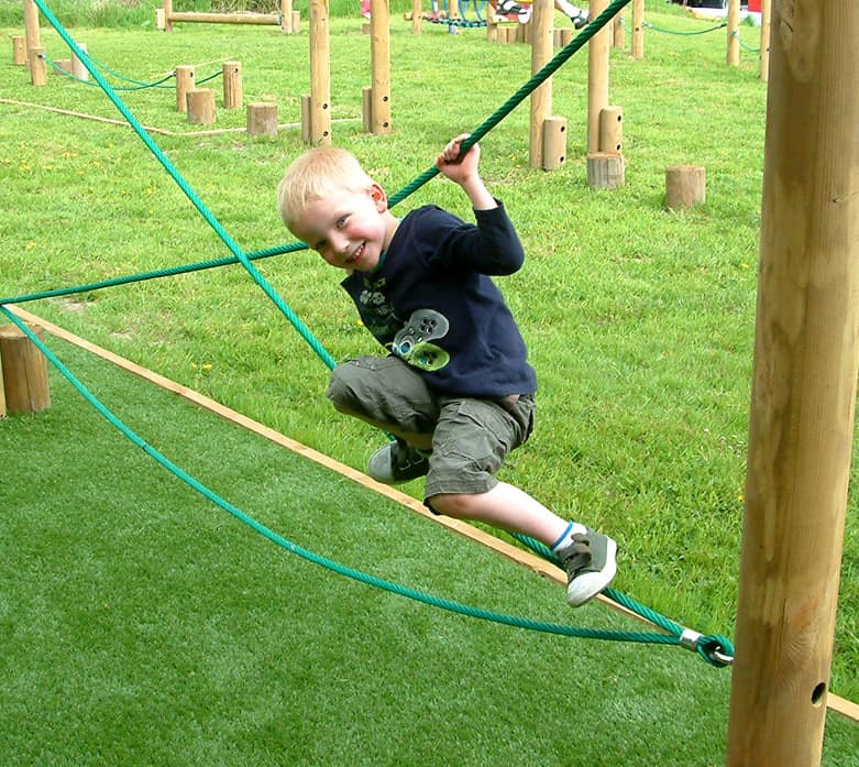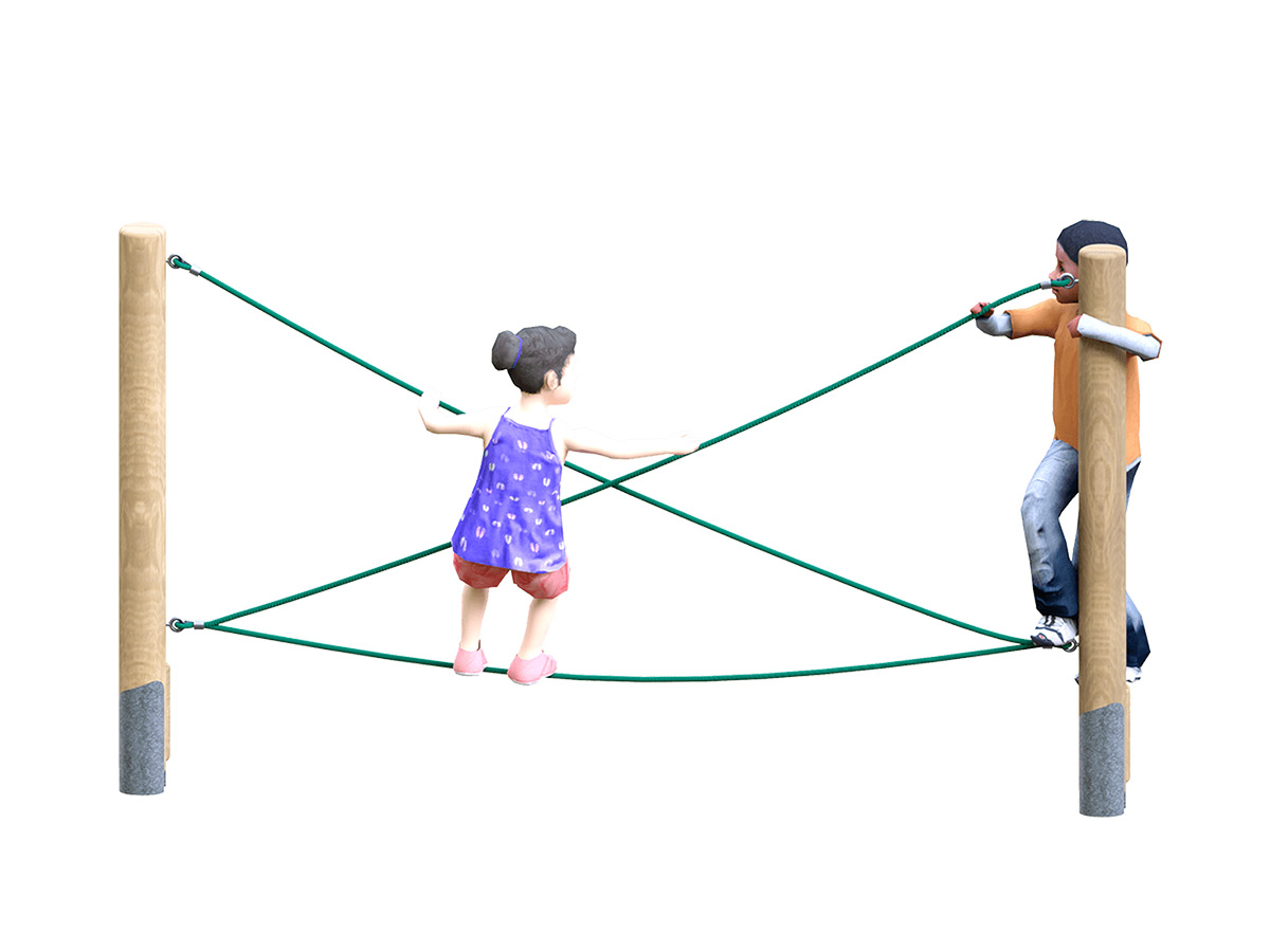 Materiais: Postes de madeira laminada de alta qualidade, redondos, de pinho de crescimento extremamente lento, retirado de florestas totalmente sustentáveis ​​com acreditação FSC ou PEFC, com secções produzidas de acordo com a norma EN 386: 2001, bordas salientes acabadas com um raio maquinado para conferir um acabamento suave e sem lascas de acordo com a EN 1176, e sujeitos a tratamento a alta pressão de acordo com as EN 351-1 e EN 335-2, isento de crómio e arsénio. Cordas com núcleo de aço resistente ao vandalismo; os pontos terminais são de aço hidraulicamente pressionado ou de ponteiras de alumínio com parafusos de aço inox (A2).
