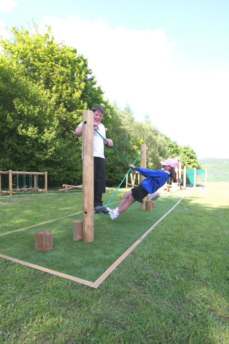 Equipamento para treino do equilíbrio, coordenação motora, agilidade e superação de obstáculos. Composto por 2 postes verticais unidos por 1 corda horizontal e 2 cordas diagonais, cruzadas.