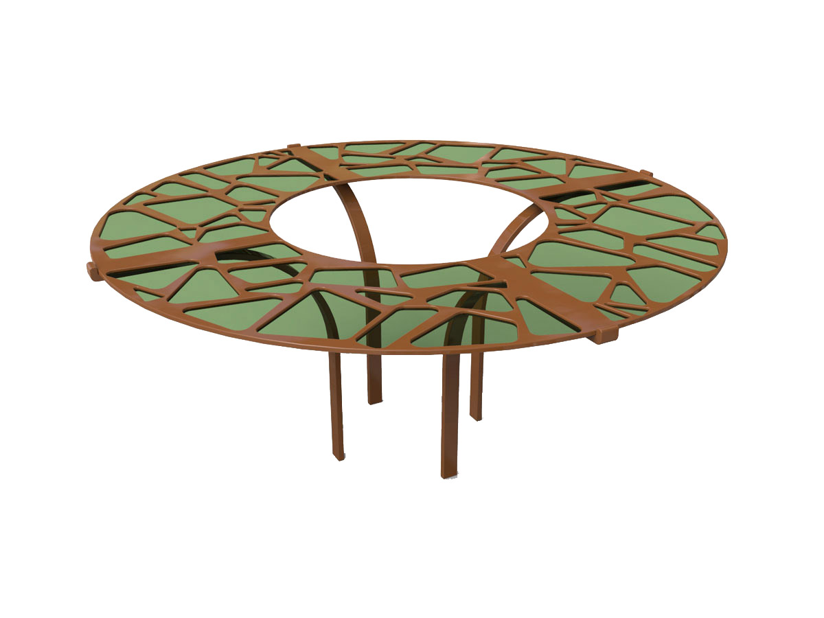 Estrutura de ensombramento escultórica PLAY IN ART®, composta por quatro postes centrais arqueados e por uma superfície no topo de forma circular, mas com uma zona circular vazia ao centro, de forma a poder ser usada em redor de árvores. A superfície de ensombramento é constituída por troços metálicos formando entre si formas triangulares e trapezoidais de acrílico transparente verde. Disponível em várias cores RAL conforme pedido (nota: metalizados e cores especiais com acréscimo de preço).