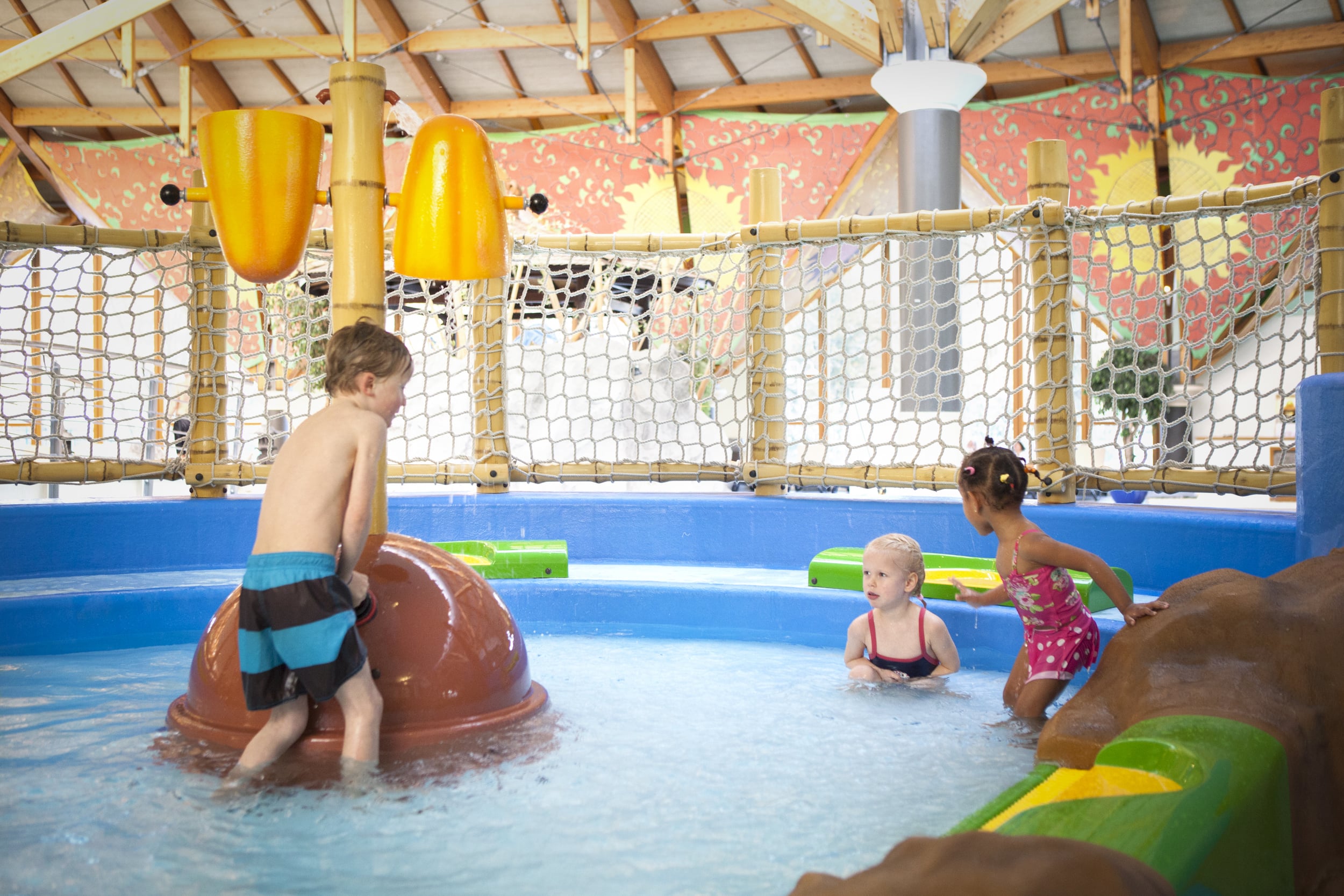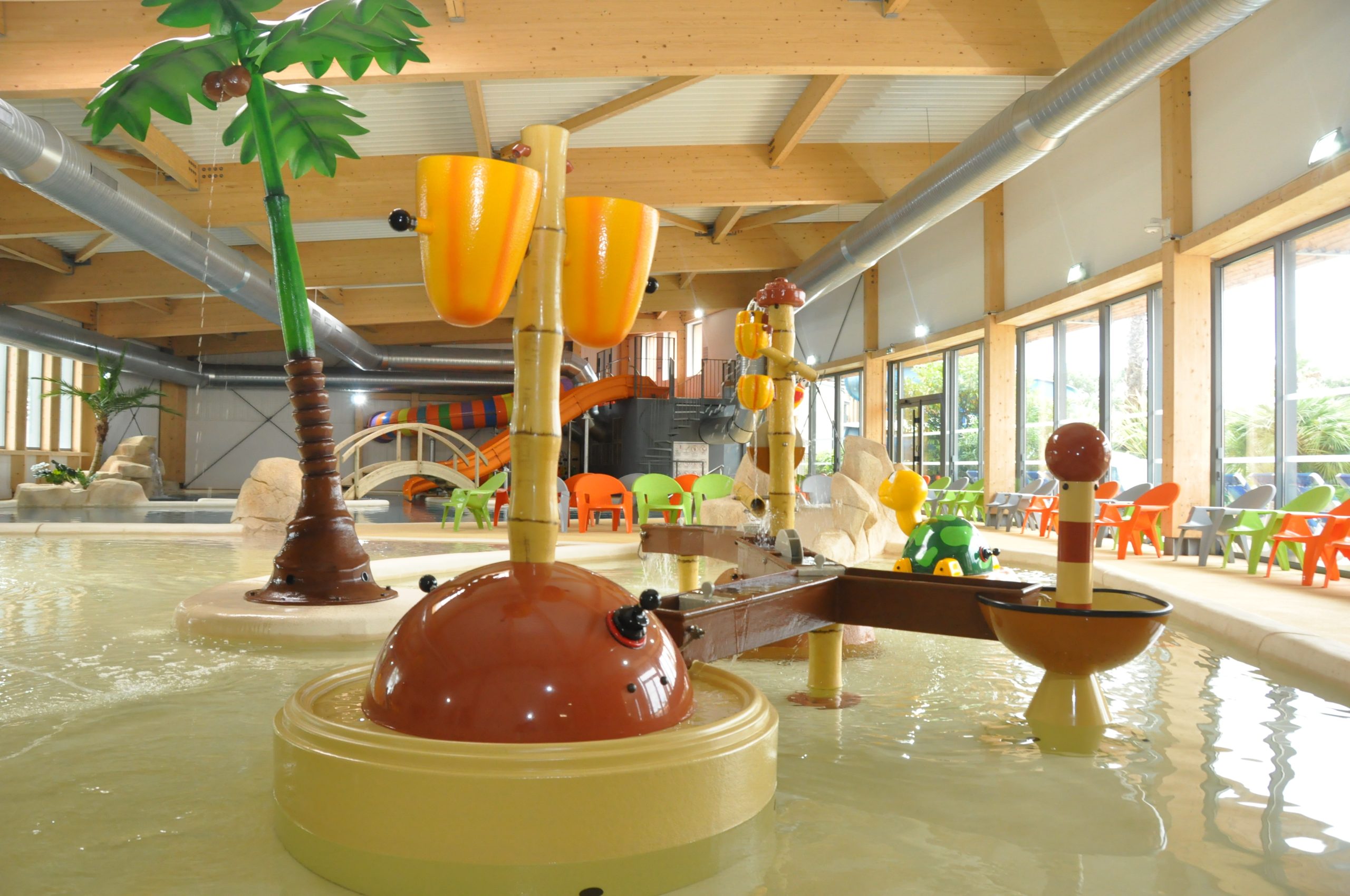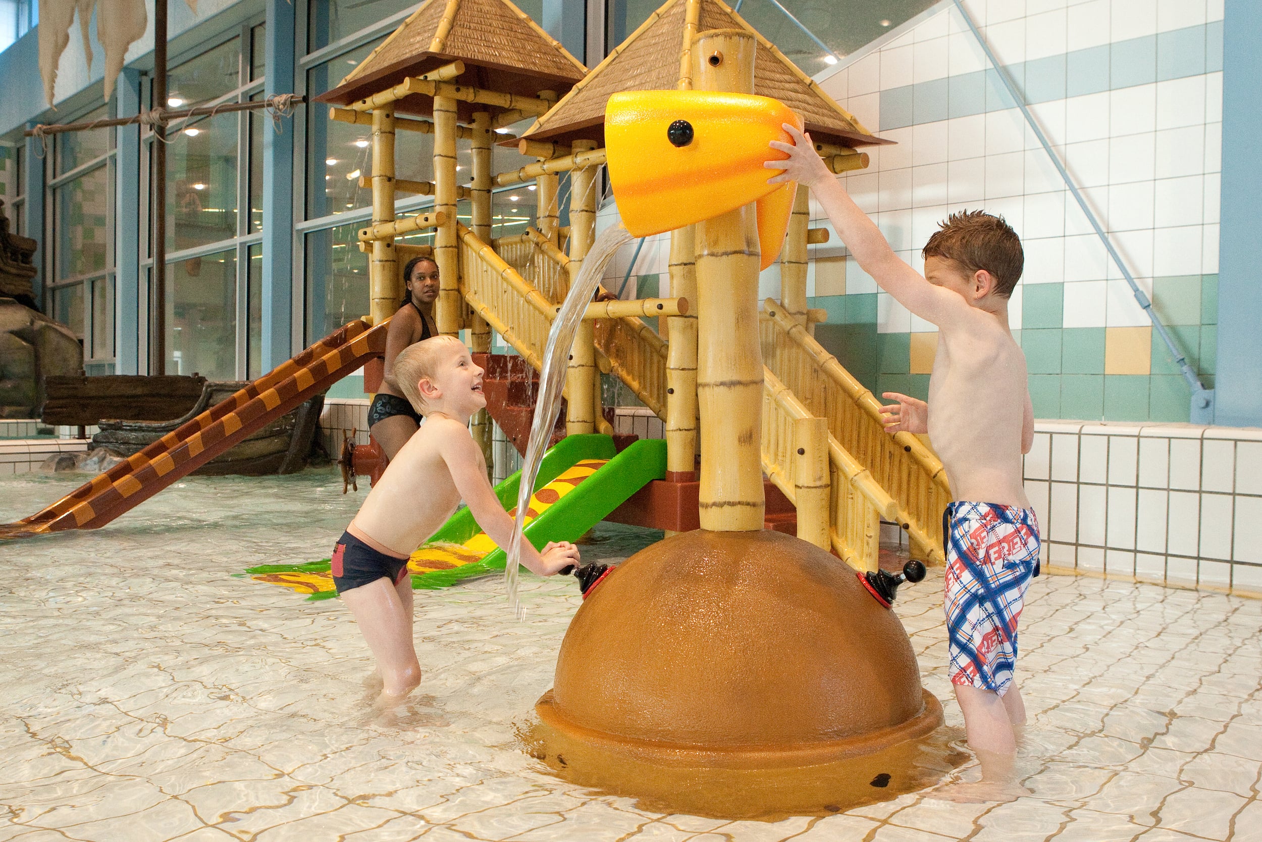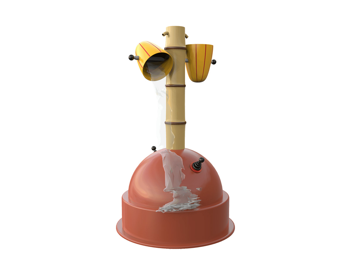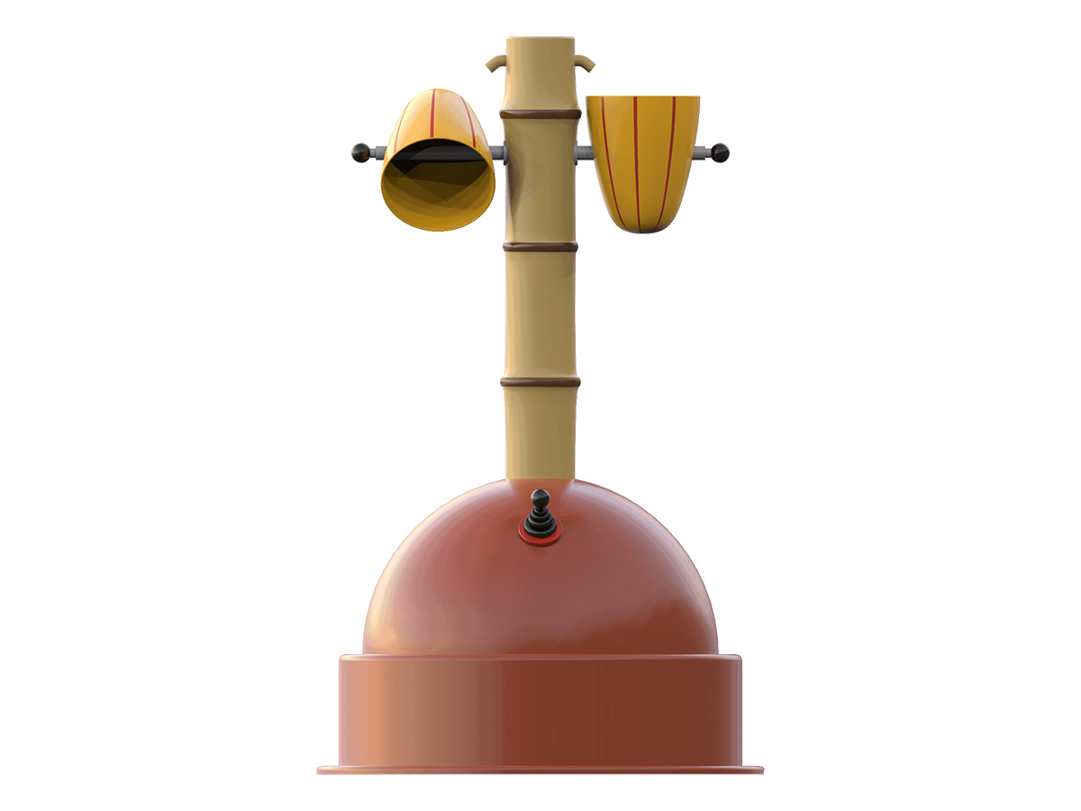 Equipamento aquático para spray park ou para colocar na entrada de piscinas de criança com profundidade mínima de 100mm e máxima de 400mm. Composto por uma um poste com a forma de tronco de bambu, ao qual estão fixos dois copos de descarga, acionados por 2 bombas manuais embutidas numa base semicircular. Bombeie o mais rápido possível usando a bomba manual. O primeiro a derrubar o copo vence.