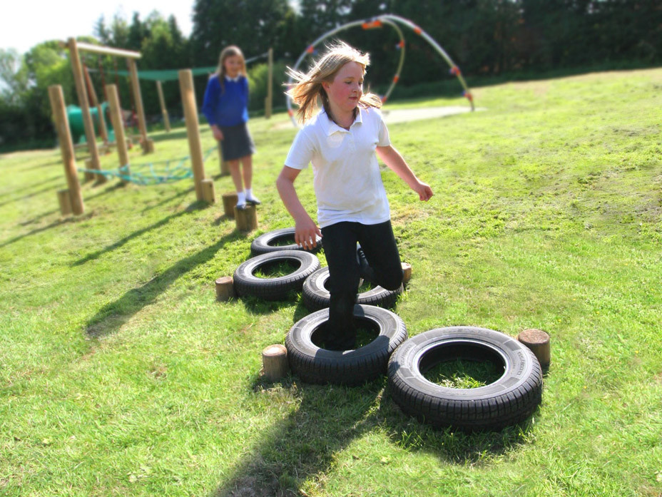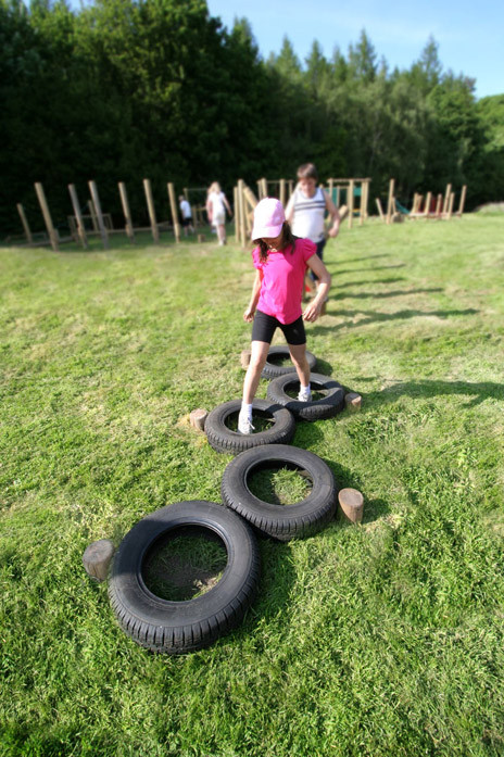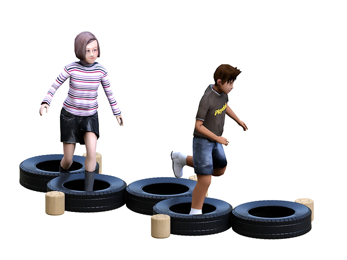 Equipamento para salto e treino da coordenação motora, agilidade e superação de obstáculos. Composto por 5 postes verticais em madeira e 5 pneus de borracha.