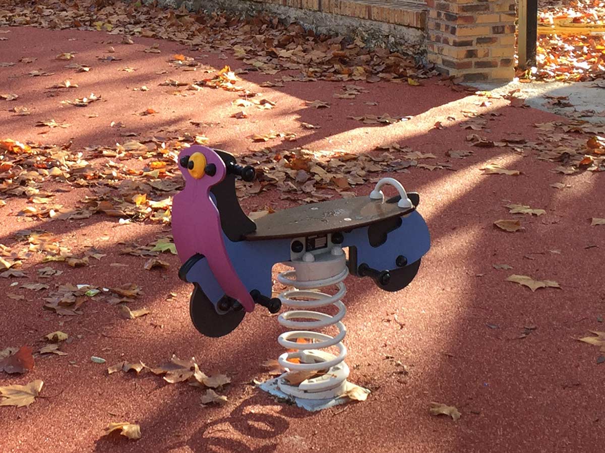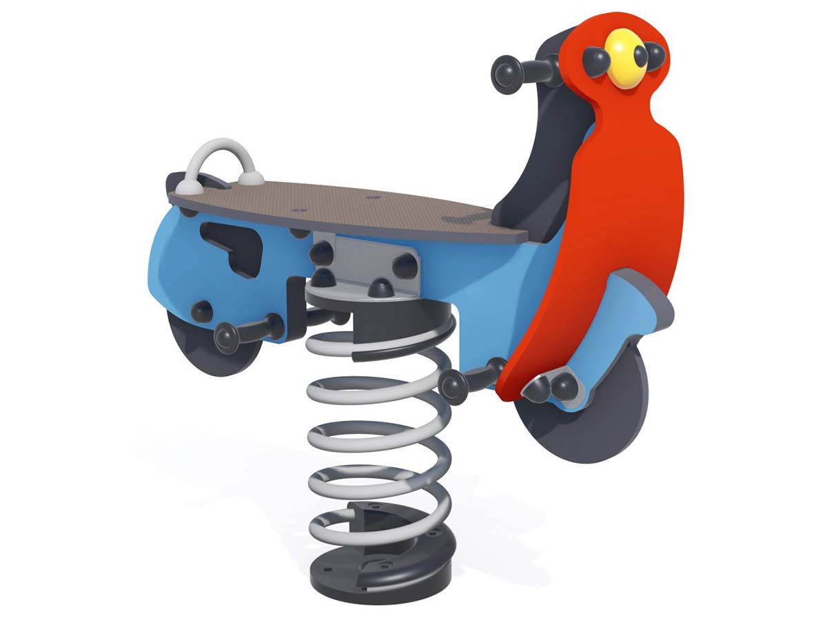 Boneco de mola com a forma de uma mota. Ideal para oscilar, socializar e equilibrar. Para fixação a sapata de betão.